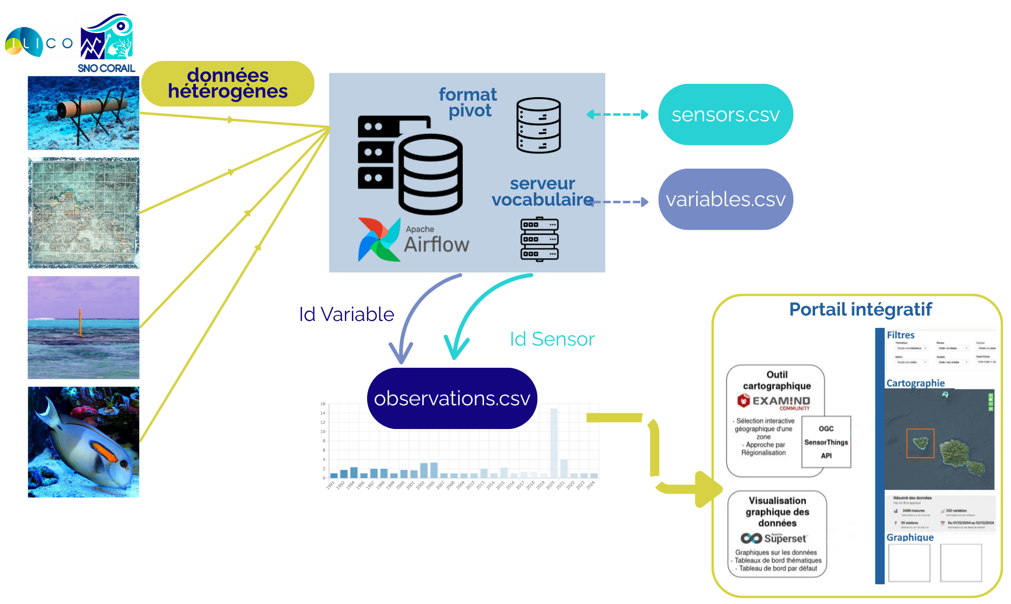 Le pôle Océan ODATIS de l’IR Data Terra a apporté son support aux équipes du SNO CORAIL pour standardiser leurs données au format pivot Sensor-Things, format qui facilite la structuration, l’agrégation et la comparaison de données multisources et hétérogènes. Cette étape garantit une compatibilité sémantique et technique des données qui permettra leur intégration dans le portail intégrateur ILICO-ODATIS. Cette intégration est particulièrement complexe du fait des nombreuses variables et protocoles suivis par le SNO CORAIL.