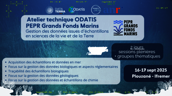 Dans le cadre du PEPR Grands Fonds Marins, le pôle Océan ODATIS de l'IR Data Terra propose un atelier technique sur la gestion des données issues d’échantillons en sciences de la vie et de la Terre. Les objectifs de cet atelier sont les suivants :