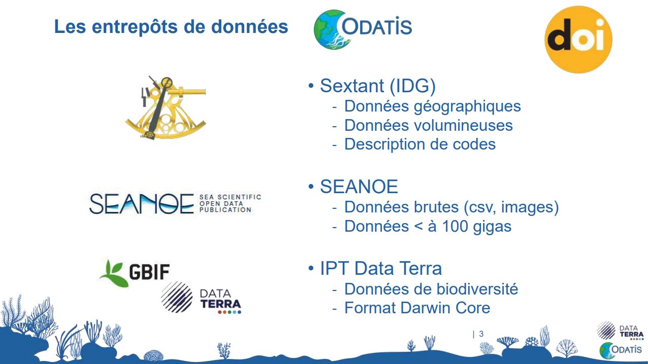 - Guide Où déposer ses données ? Le pôle Océan ODATIS conseille plusieurs entrepôts délivrant des DOI suivant les types de données et les situations.
