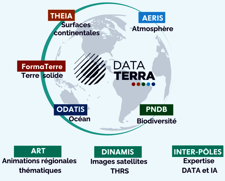 L'Infrastructure de Recherche (IR) Système Terre, nommée Data Terra regroupe ces cinq pôles de données auquel se rajoute des services transversaux comme DINAMIS, dédié à l'accès aux images satellites à haute résolution. L'IR - Pôles observation de la Terre - figure sur la feuille de route des infrastructures de recherche du Ministère de l'Enseignement Supérieur, de la Recherche et de l'Innovation (Feuille de route Infrastructures de recherche 2018, édition n°2, lien pdf). L'Office Français de la Biodiversité (OFB) sera en forte collaboration avec l'IR Système Terre et ses 4 pôles.